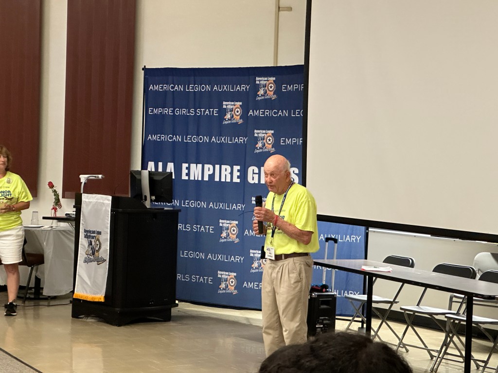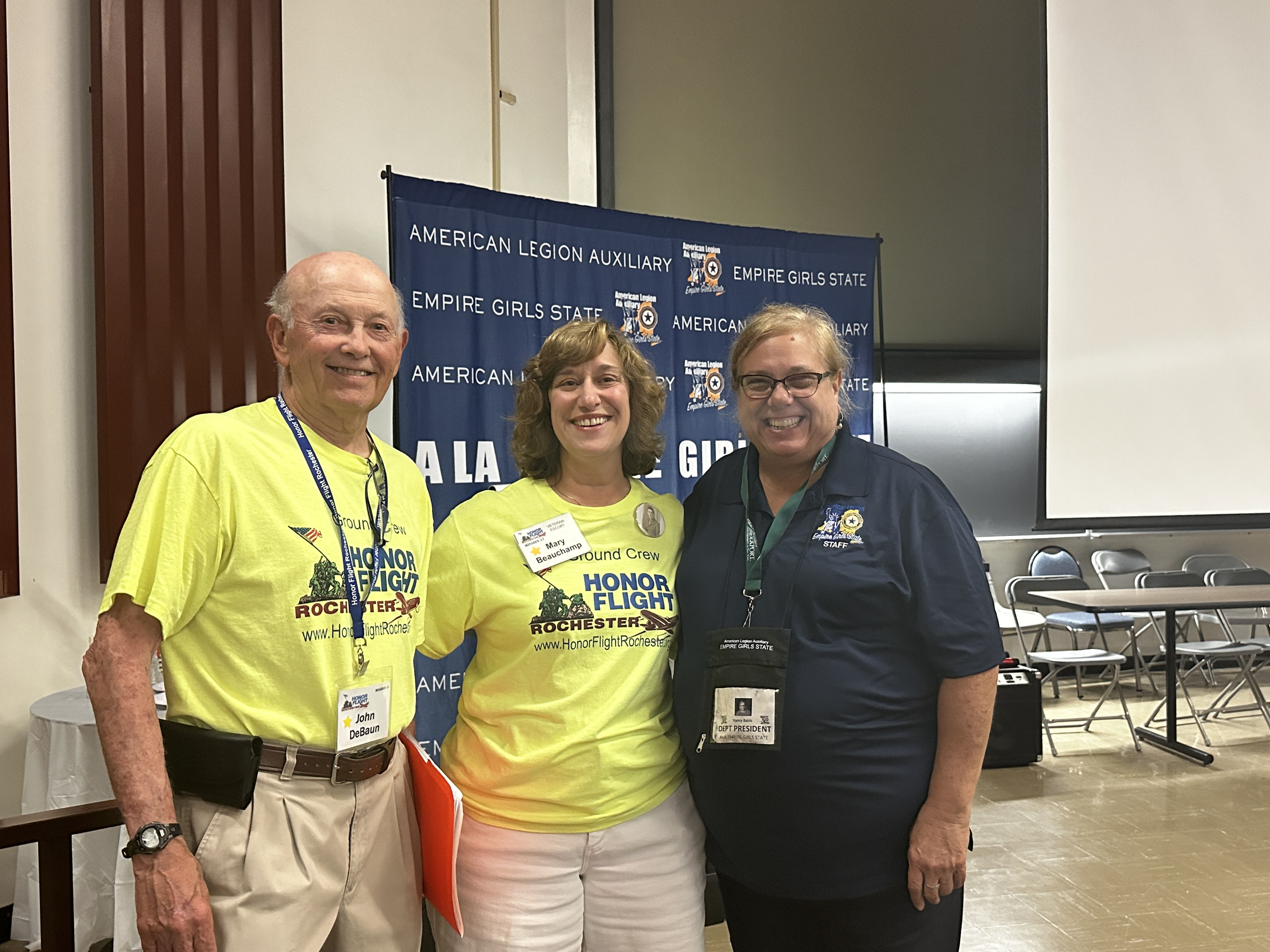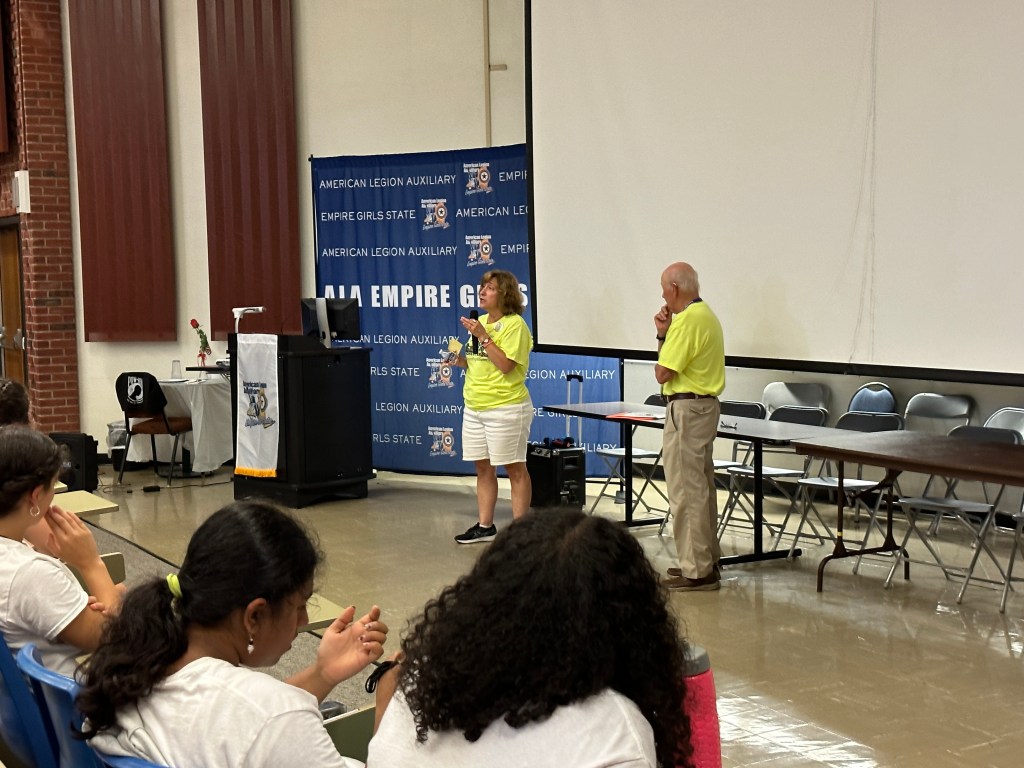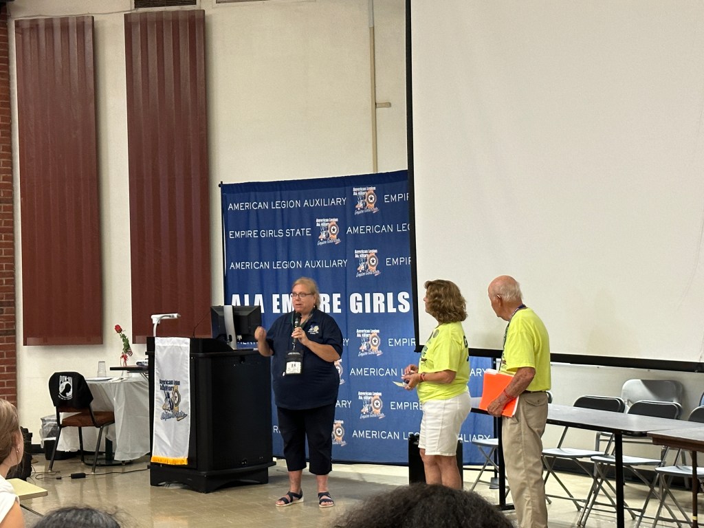 ALA Department of New York President Nancy’s project this is Honor Flight. Two members of Honor Flight came to speak to the ALA EGS citizens about the program. Honor Flight is a nonprofit organization which gives veterans the opportunity to visit the National Monuments in Washington,D.C. This helps veterans connect with one another, remember the fallen and share their stories and experiences with other veterans. It is free of charge thanks to the donations they receive. At ALA Empire Girls State. citizens participated in service project in which they made fleece lap blankets for the veterans and wrote cards for them.