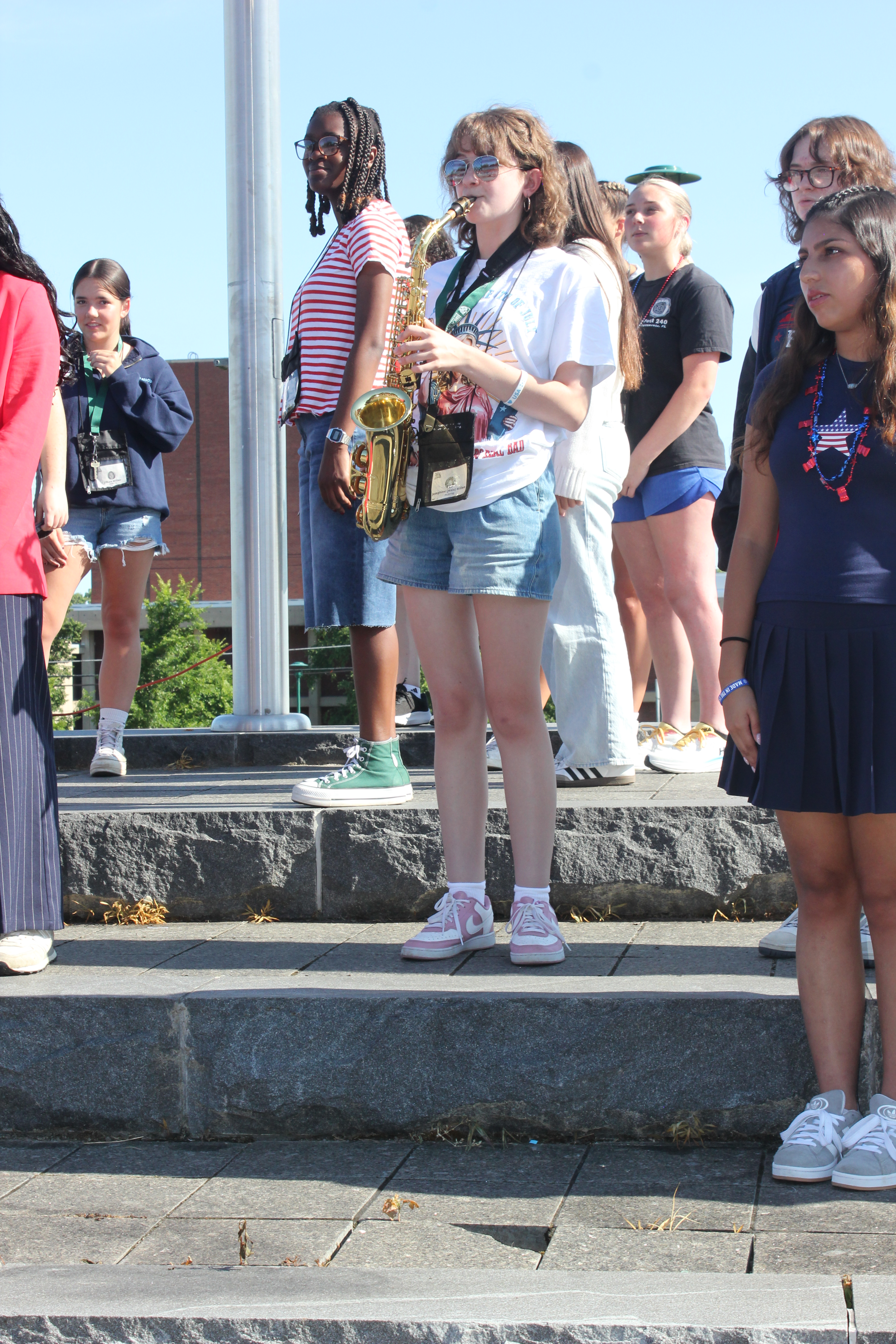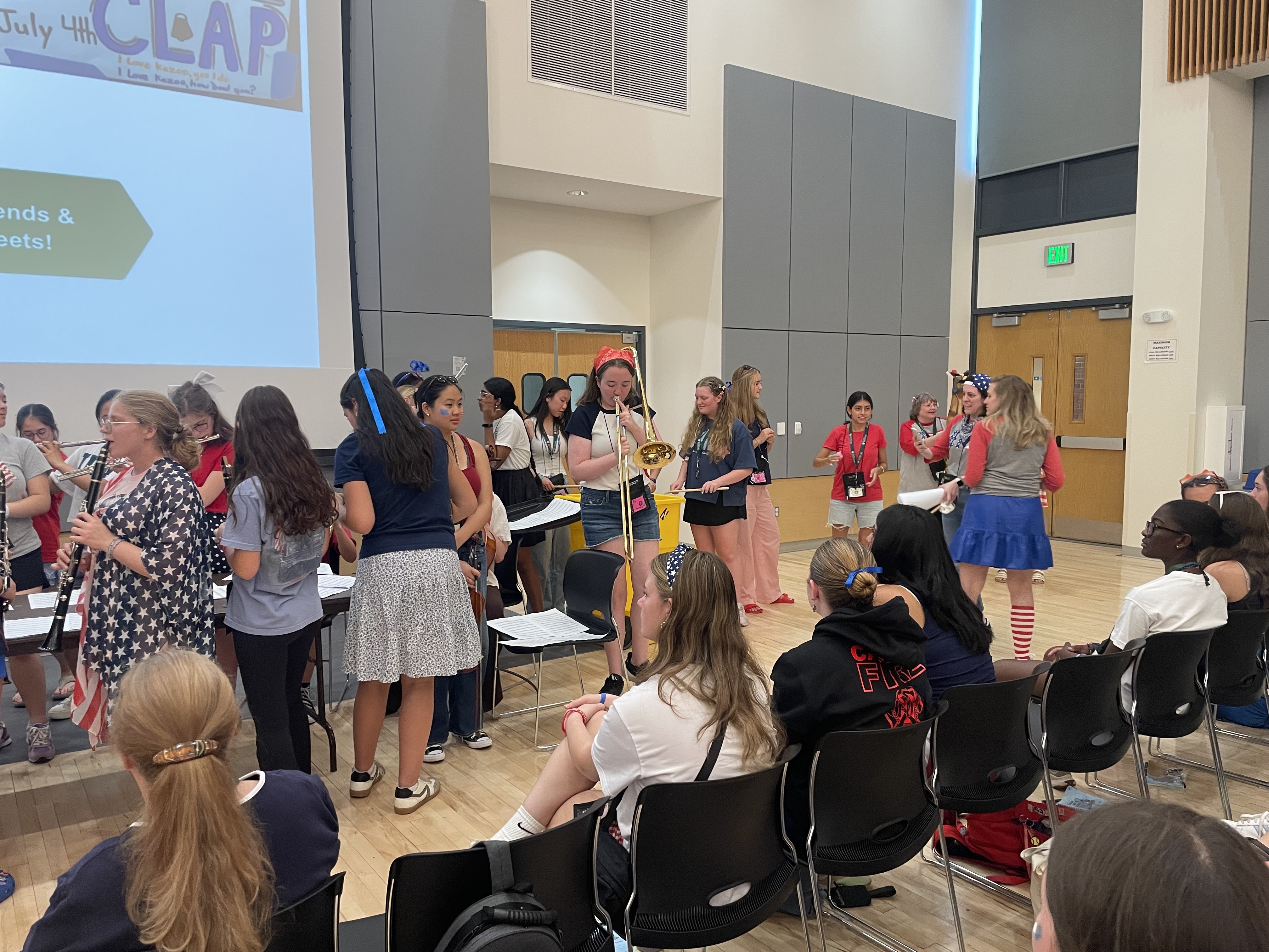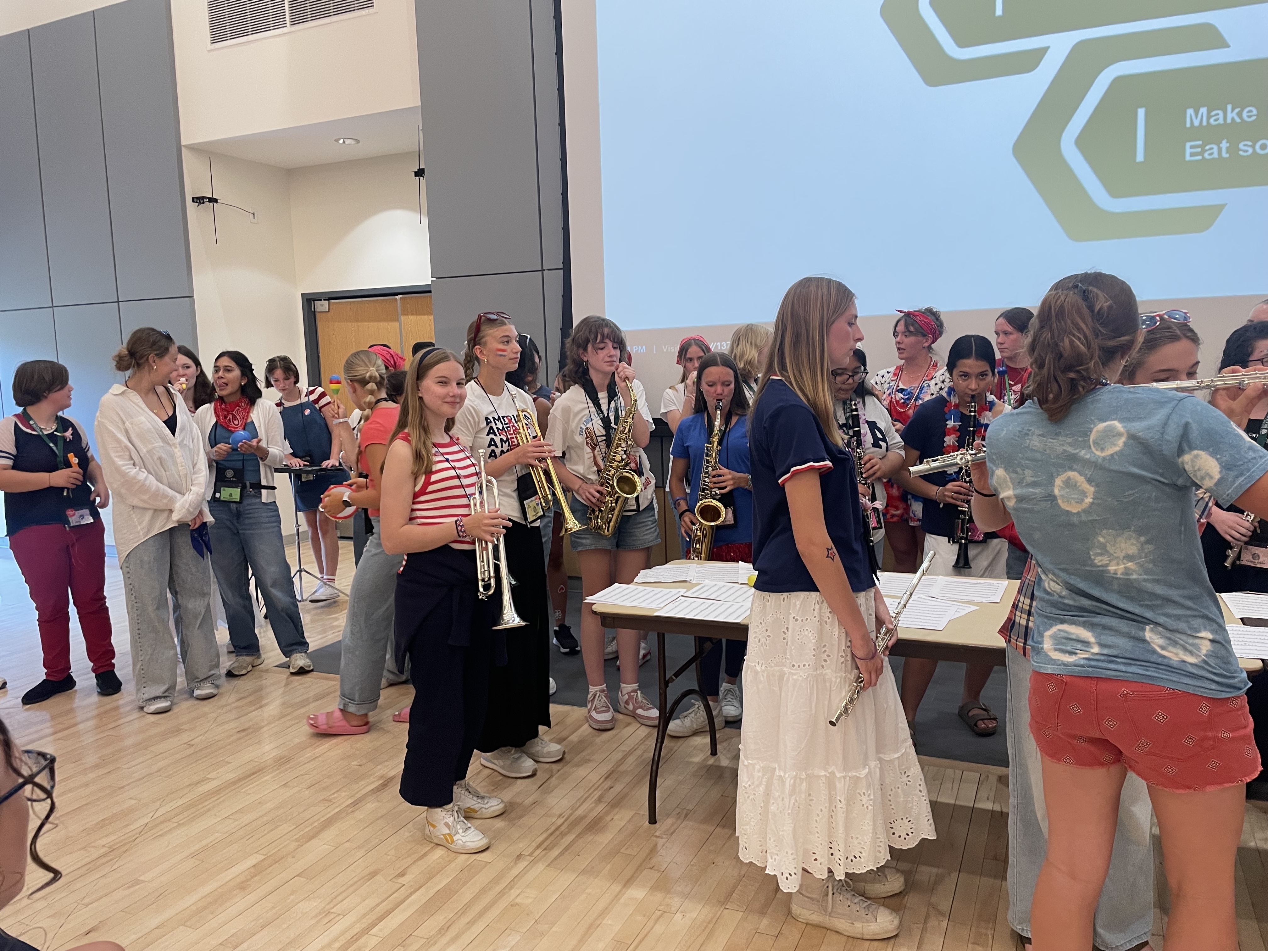 Their spirited rendition of “What Makes You Beautiful” by One Direction brought the crowd to life, complete with a full (and delightfully eclectic) ensemble: flutes, trumpets, saxophones, a cello, an electric guitar, a glockenspiel, and an expansive percussion section featuring everything from maracas to Helena the trash can drum.